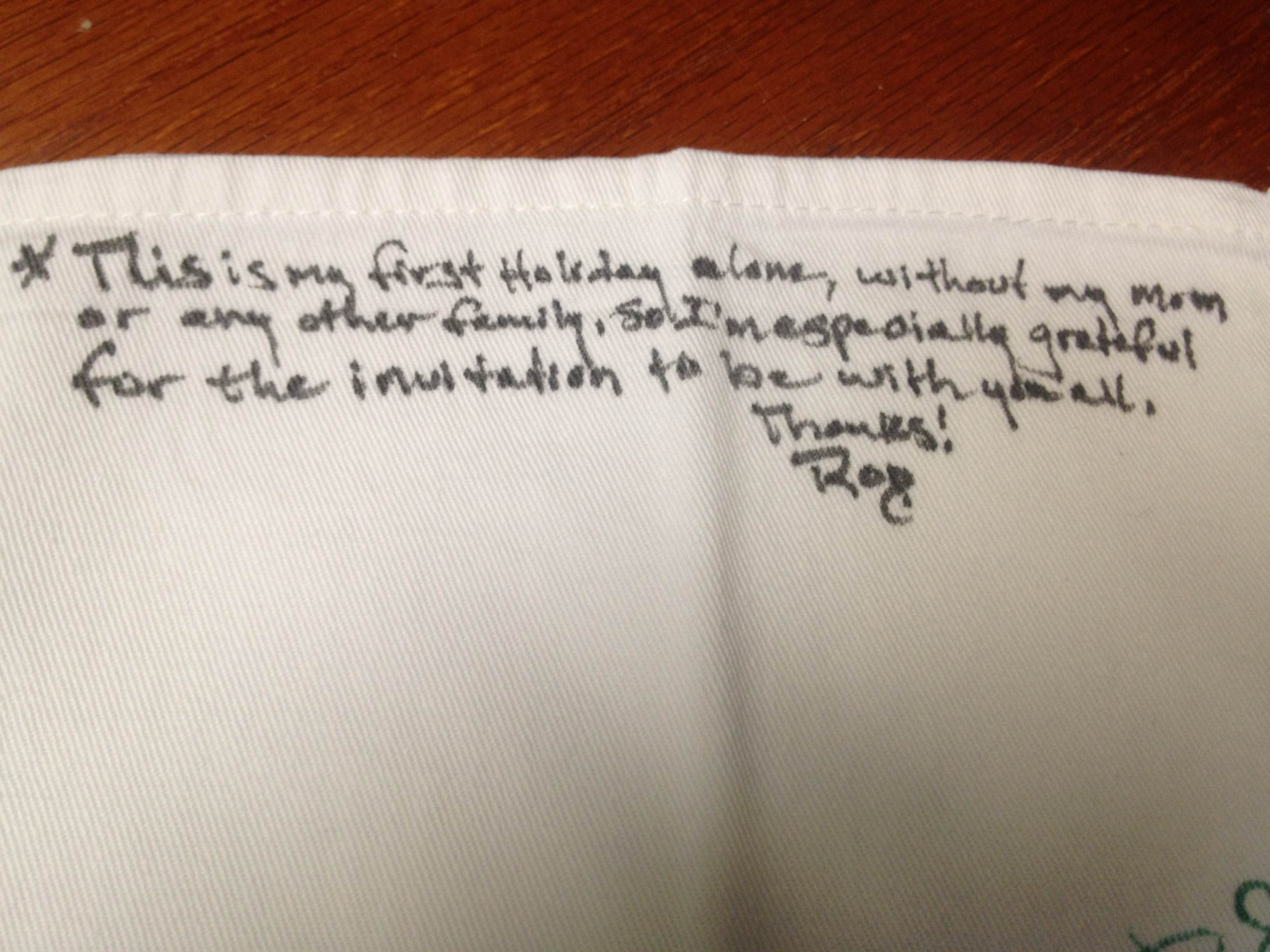 We have a tradition each year of writing what we are grateful for on our napkins. This is what Rodney wrote on his napkin...